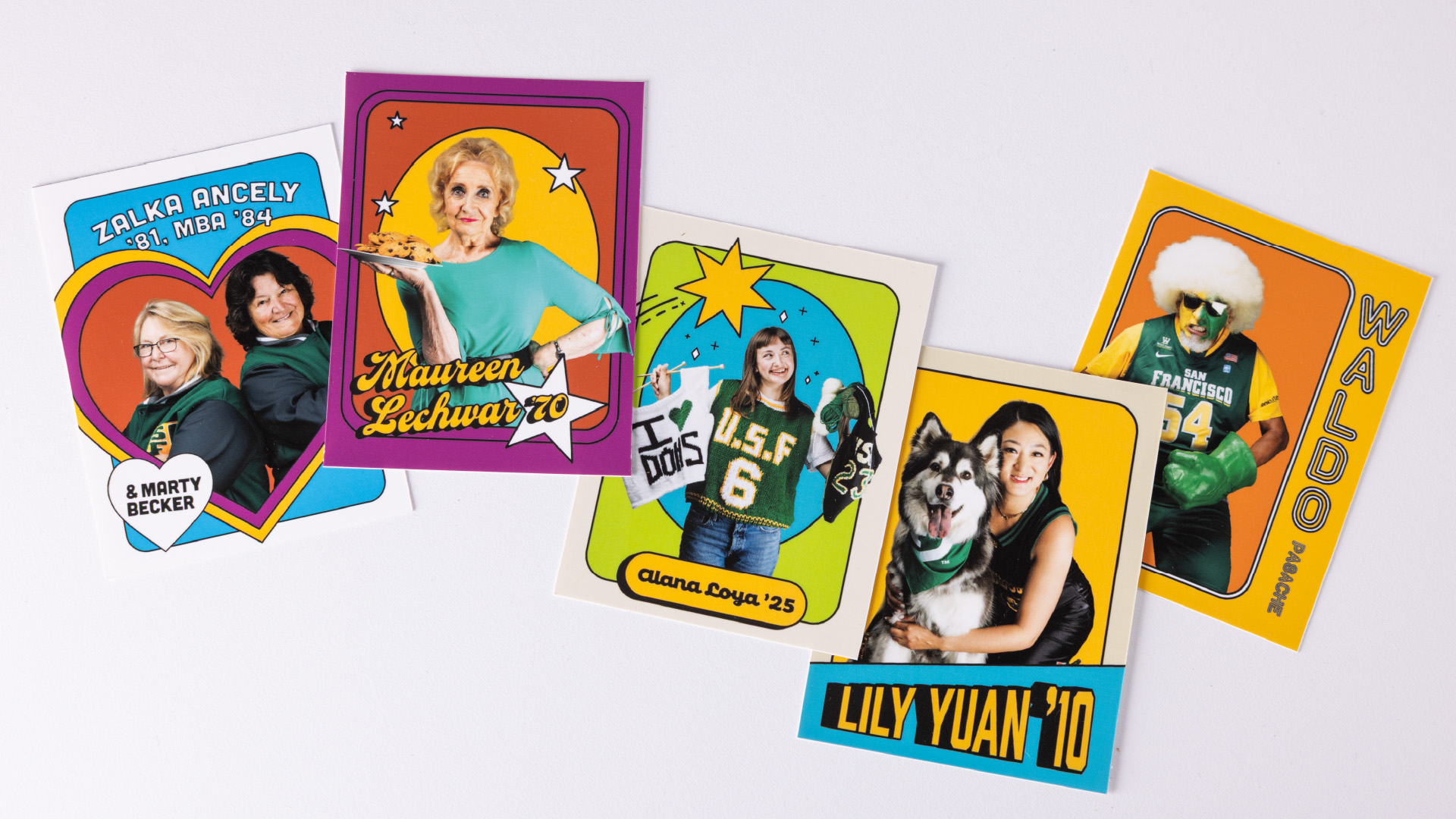 But it’s not just at far-away games that Yuan uses her outfits to find her tribe. This past August, during her first week in a new role at Envoy, a global workplace management software company, she wore green and gold heels (and created a USF Slack channel) on day two and wore her lucky USF dress on day four. She plans to sport the USF puffer vest-turned-jersey she’s been crafting this winter and wants to make a request to the USF bookstore: “Start carrying Dons dog merchandise!” She’d like it to match her USF license plate frames.
