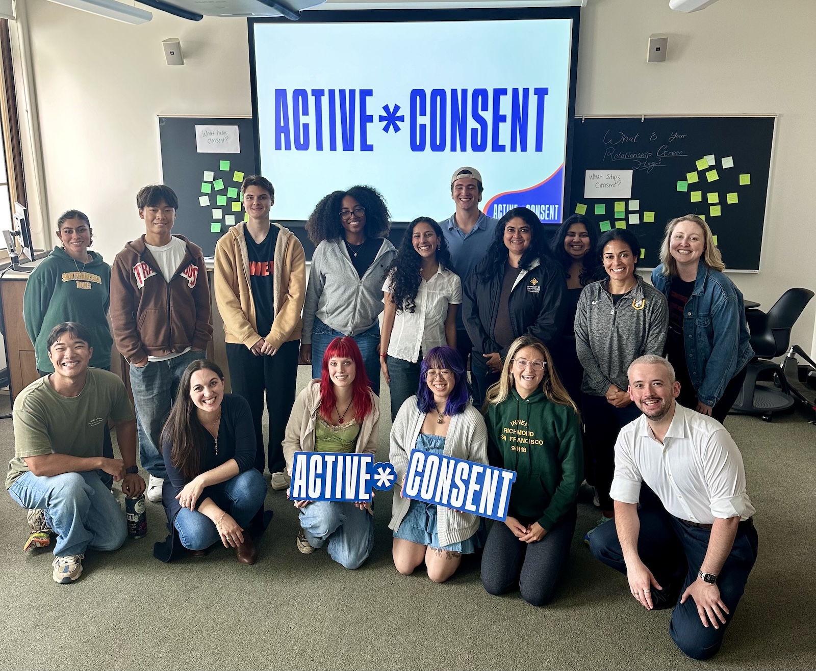 In August, USF brought the Active Consent team to campus for two days of training. A dozen student volunteers stepped up and learned the 90-minute workshop curriculum. Since then, the students have led 12 workshops for student organizations across campus, and expect to lead 10 to 15 more in the spring semester.